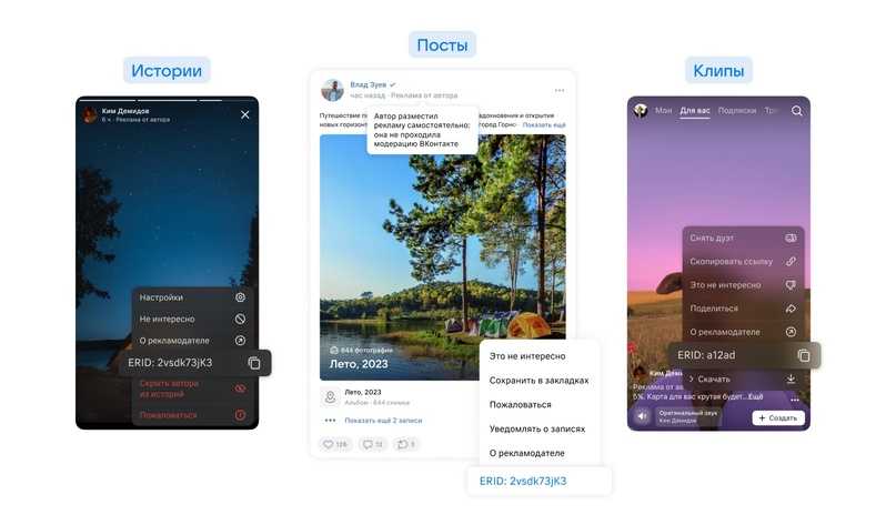 По правилам, отметка о рекламе и токен должны быть на самом рекламном объявлении — в начале текста или на фото и видео, если текста нет. Но есть другой вариант — если вы добавляете отметку о рекламе и токен в записях и историях ВКонтакте, то она будет гармонично показываться рядом с публикацией.