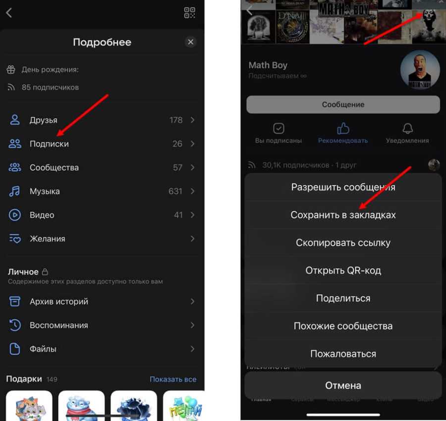 От пабликов в мобильной версии избавляются тем же способом: отписаться и добавить в закладки. Для этого нужно зайти на каждое из них, выбрать в настройках «уведомлять о новых записях», а затем отписаться. Все скрытые группы исчезнут из общего доступа, а для вас будут отображаться на строке «закладки». Если ее нет — настройте отображение через веб-версию с телефона или компьютера: