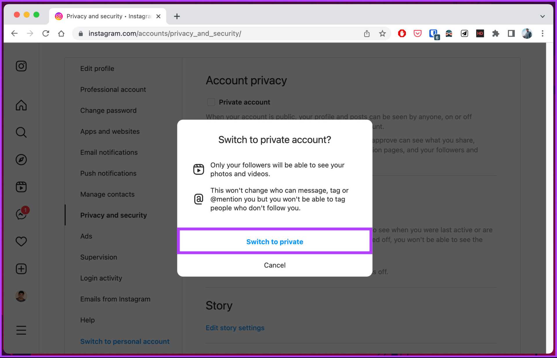 Шаг 6: во всплывающем окне «Переключиться на частную учетную запись» выберите «Переключиться на частную».