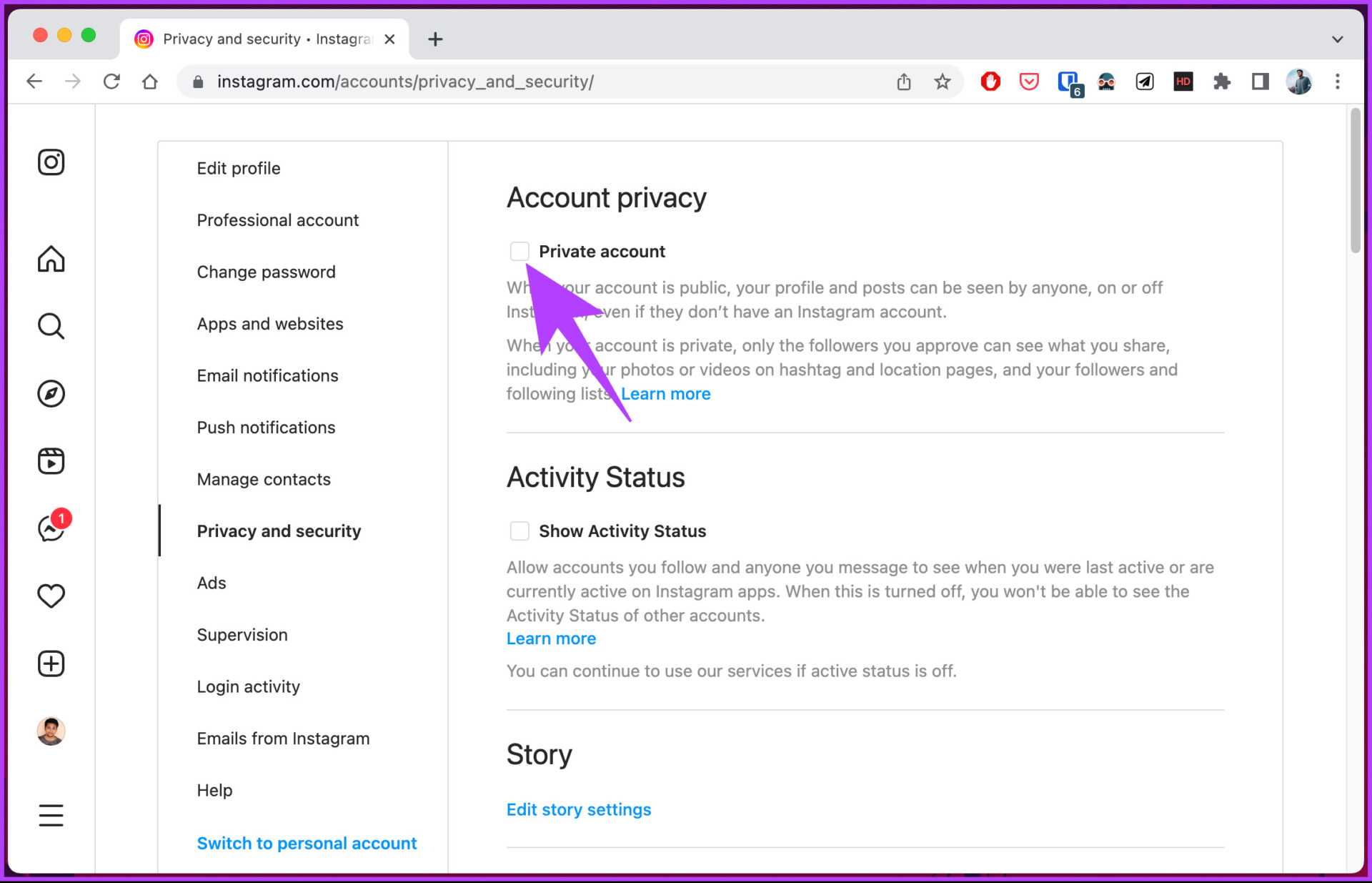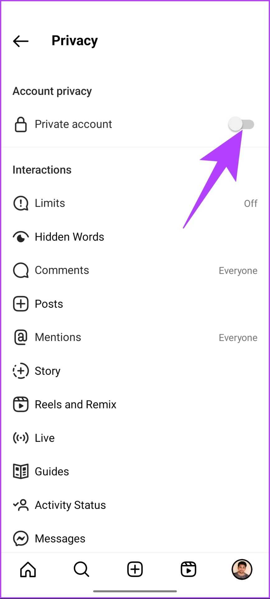 Шаг 5: в разделе «Конфиденциальность» включите параметр «Частный аккаунт».