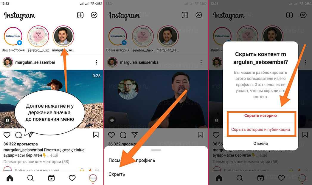 Ну а если сторис становится слишком много, и вы рискуете пропустить что-то действительно интересное — стоит скрыть сторис неважных для вас пользователей. При этом не стоит переживать, что пользователь обидится — он даже не узнаёт, что вы скрыли сторис из ленты. Для того чтобы скрыть сторис, выполните следующие действия: