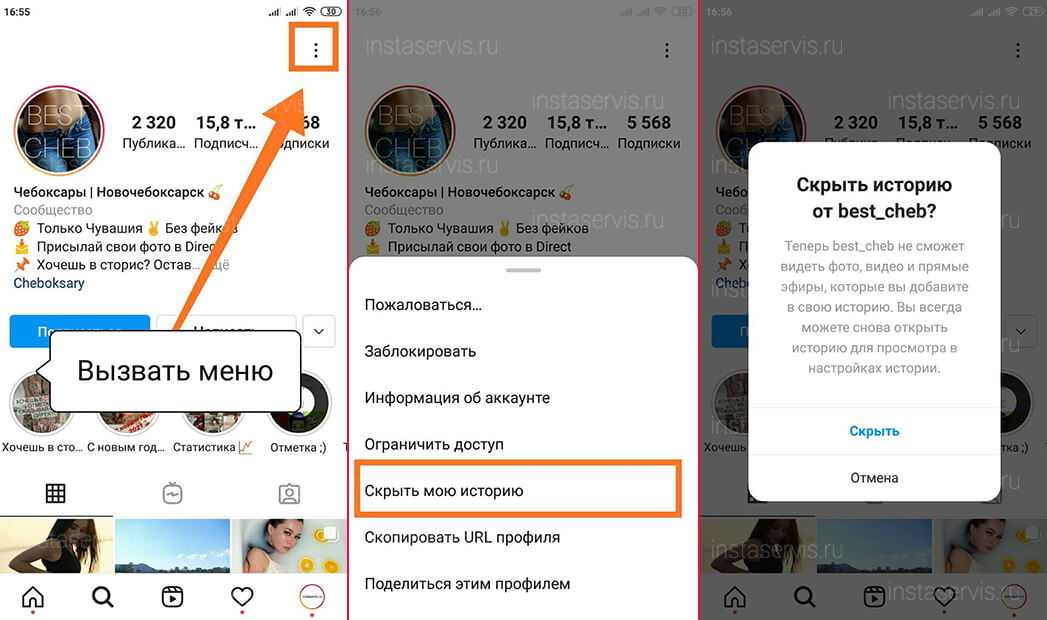 Совет: Вы также можете скрывать посты и истории, нажав на «…» в углу истории.