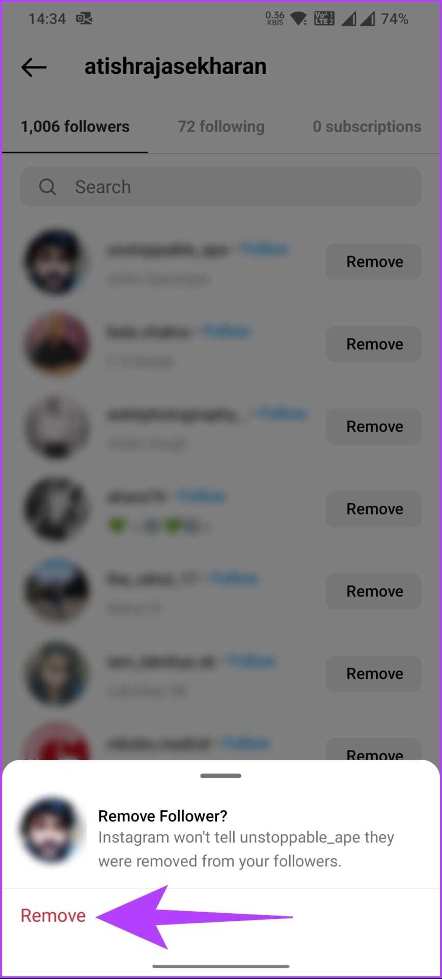 Шаг 8: в списке подписчиков нажмите «Удалить» рядом с пользователем, от которого вы хотите скрыть свою публикацию.
