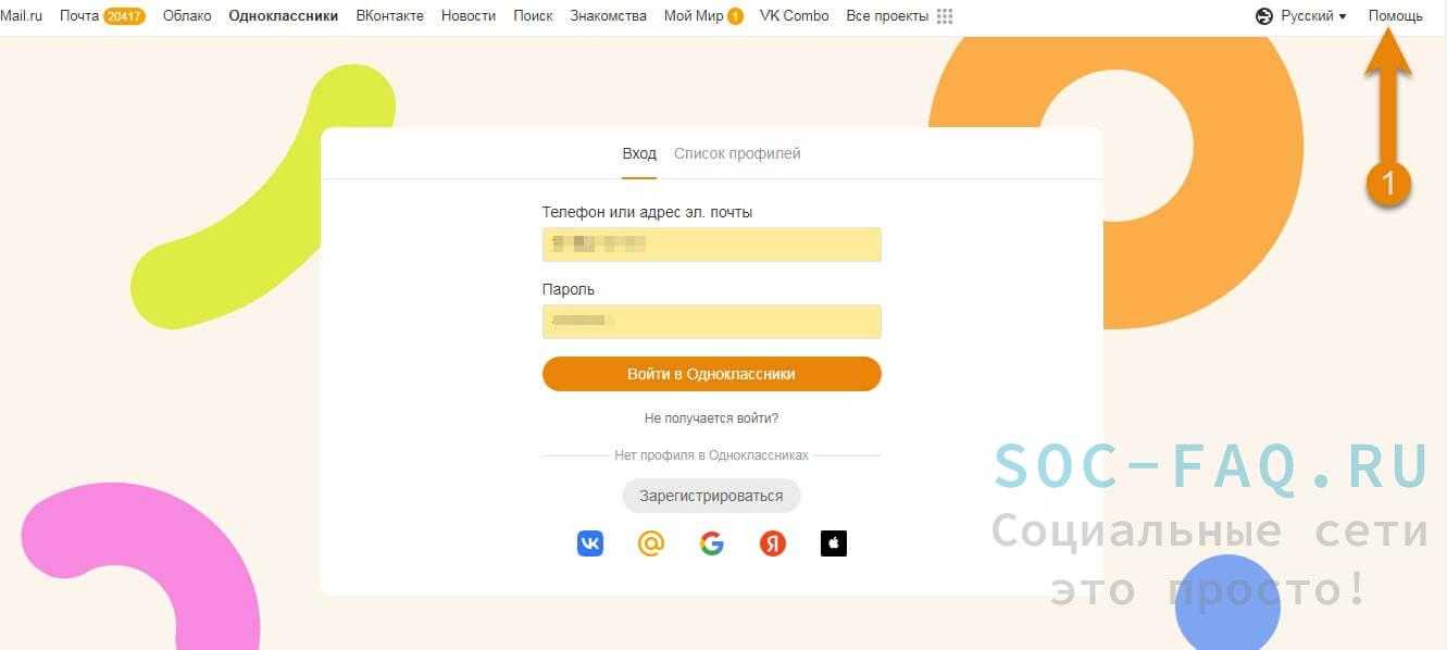 Войдите на стартовую страницу «Одноклассников». Нажмите кнопку «Помощь».