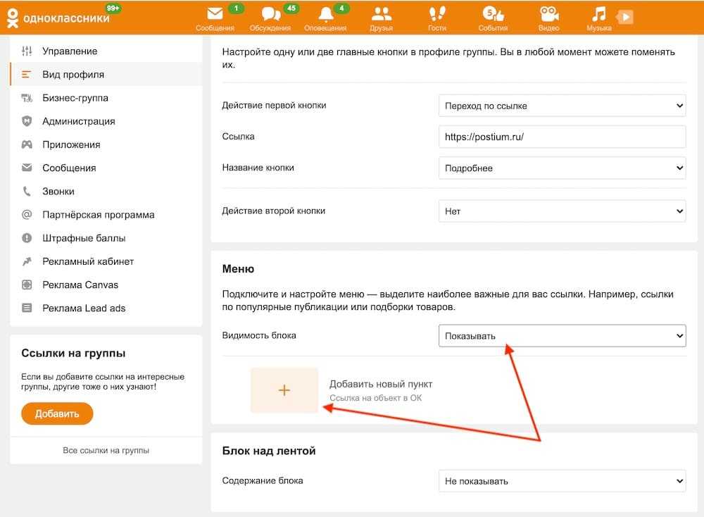 Рис. 44.9. Настройки группы в Одноклассниках.