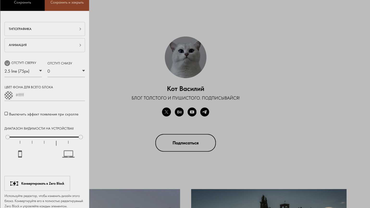 В открывшейся панели можно поменять типографику или фон страницы, добавить к ней анимации или конвертировать всё в Zero Block (нулевой блок) ― профессиональный редактор, позволяющий создавать блоки с собственным дизайном.
