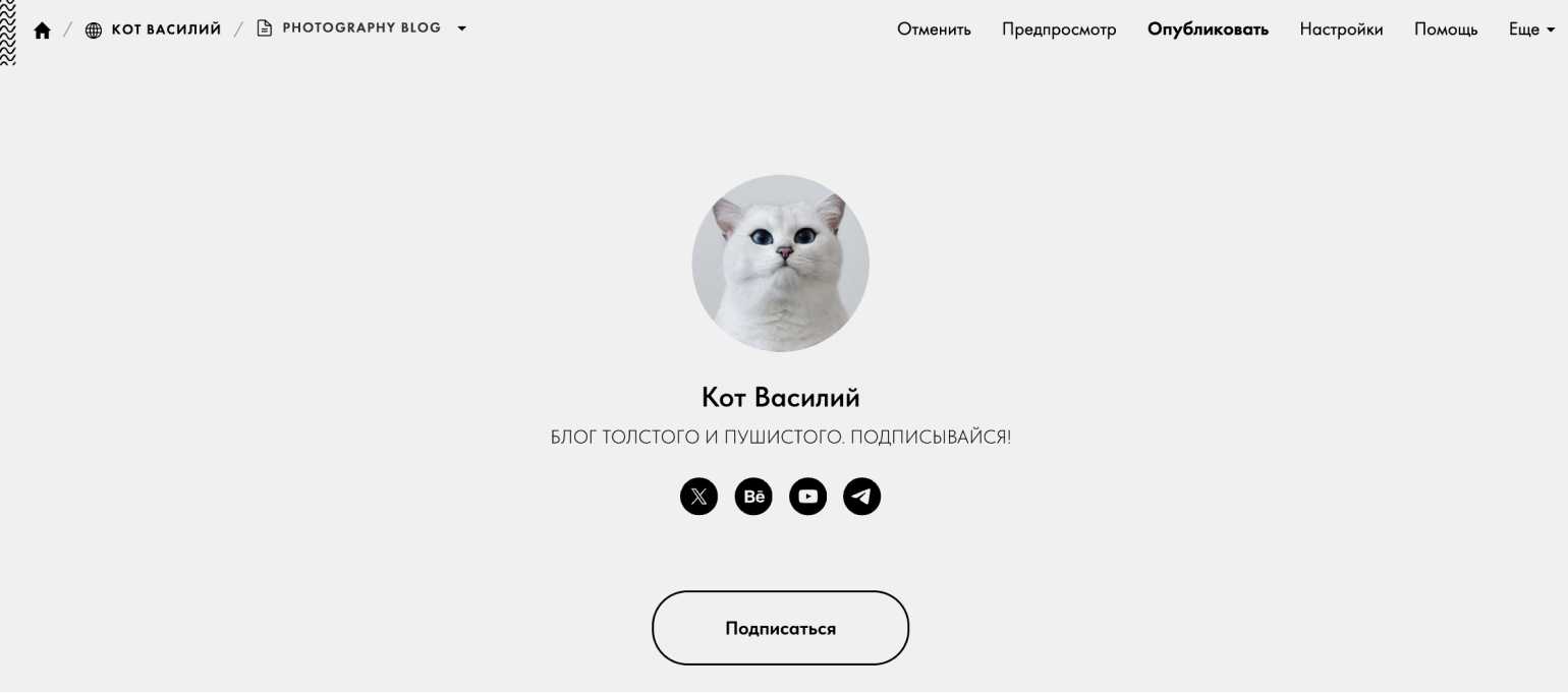 Мы решили сделать блог для кота Василия. Для этого заменили шрифты, цвет фона и размер кнопки, добавили изображение и текст с описанием.