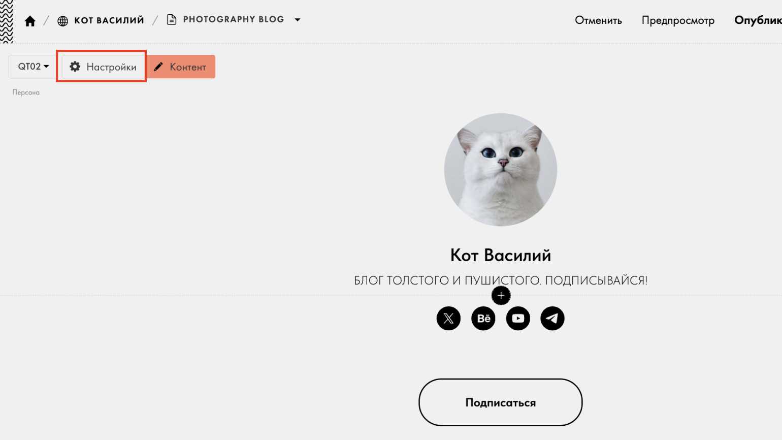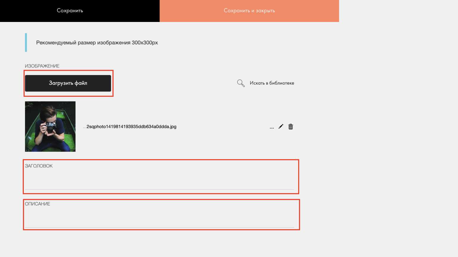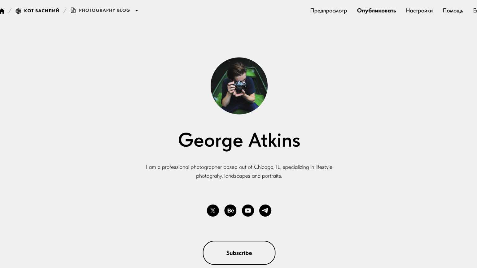 Сейчас все элементы сайта стандартные. Заменим их на уникальные. Чтобы это сделать, нажмите на . Загрузите фотографию профиля, впишите необходимый заголовок и описание: