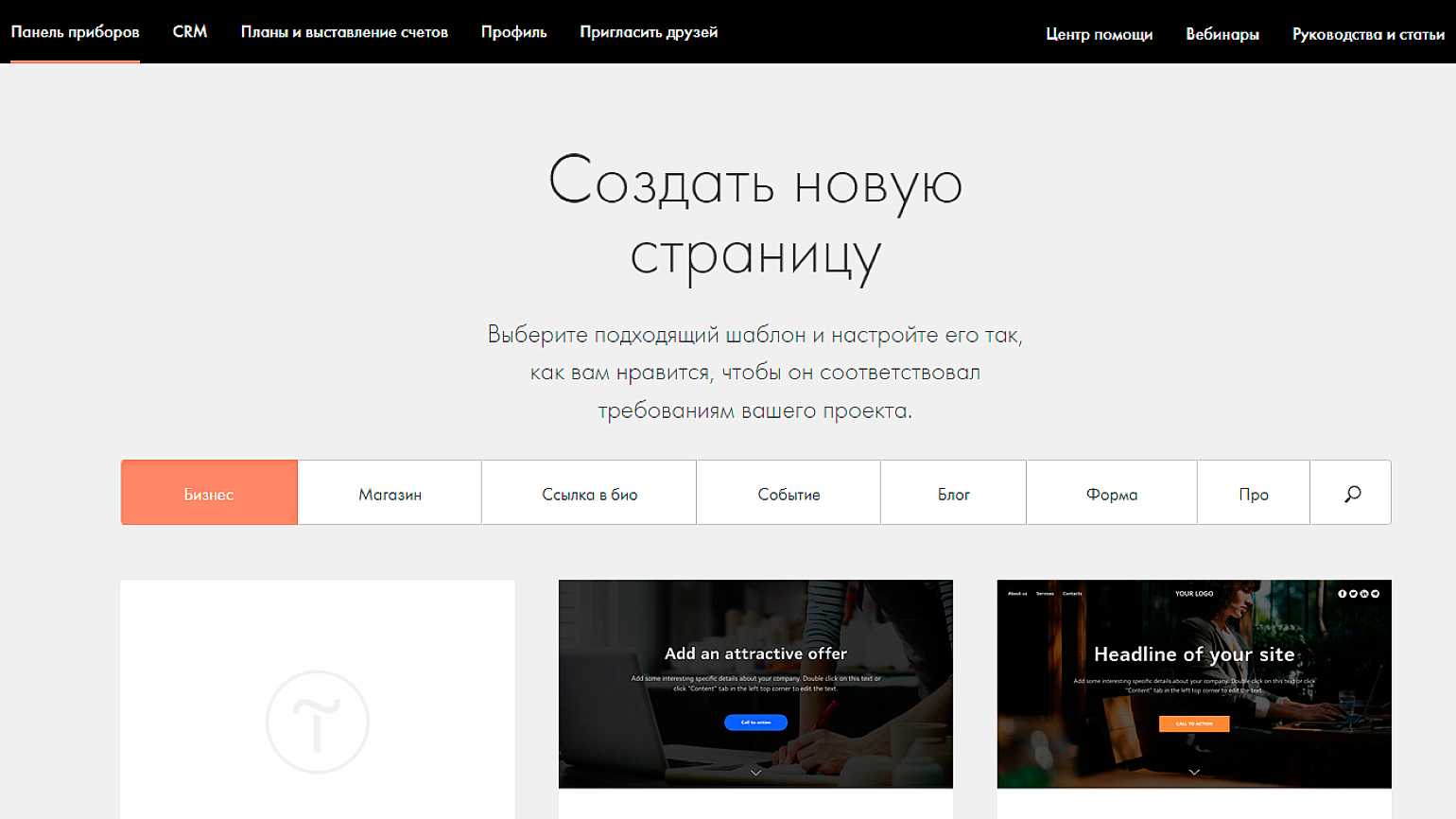 В нём можно выбрать готовый шаблон или создать чистую страницу с необходимыми блоками.