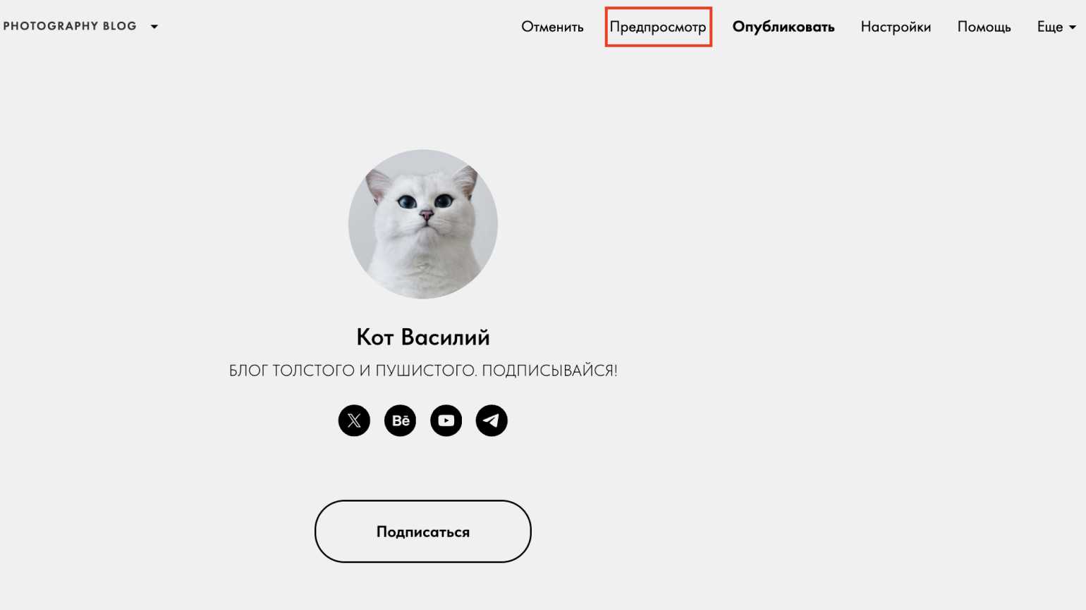 Он содержит поля с текстом, фото и интерактивные элементы, например кнопки. На странице предпросмотра можно увидеть, как сайт будет выглядеть в итоге.