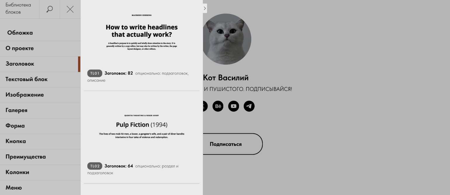 Откроется библиотека элементов: можно выбрать заголовок нужного размера, вставить фотогалерею, кнопку или другие блоки: