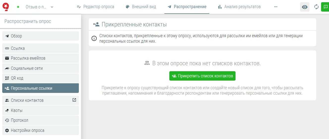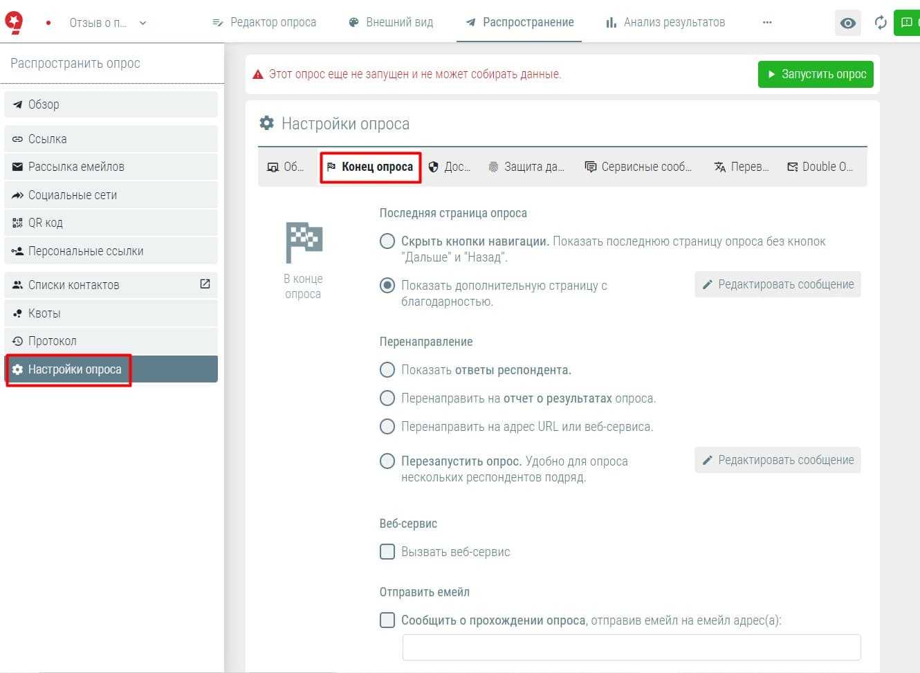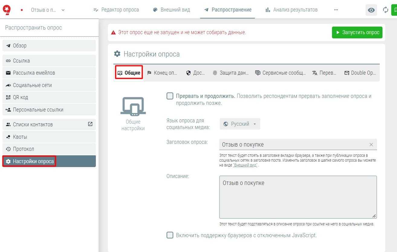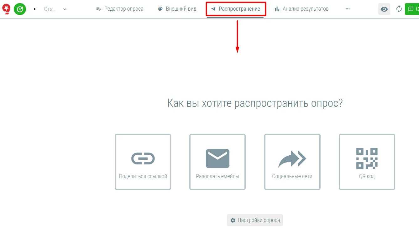 Открыв любой из вариантов распространения анкеты, мы попадаем в область настройки всех перечисленных выше вариантов распространения опроса, а также другие важные настройки.