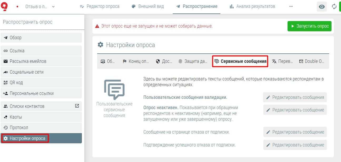 Сервисные сообщения – настройка тестовых сообщений, которые будут показываться респондентам в тех или иных ситуациях.