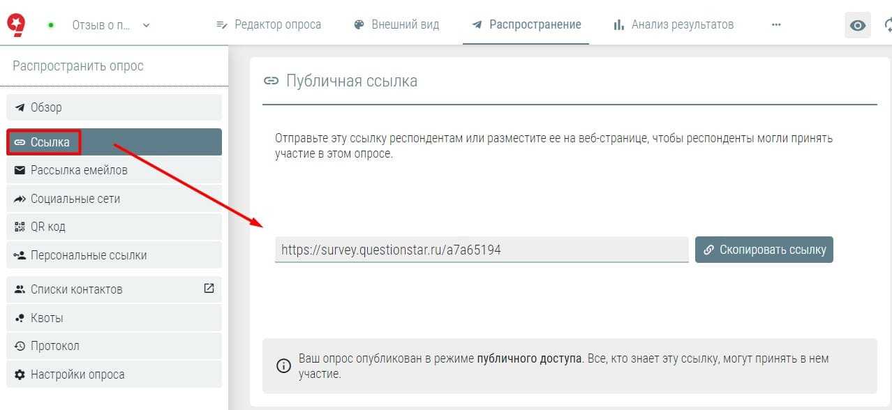 После запуска анкеты мы получим ссылку, которую можем распространять любым доступным способом нашим респондентам: