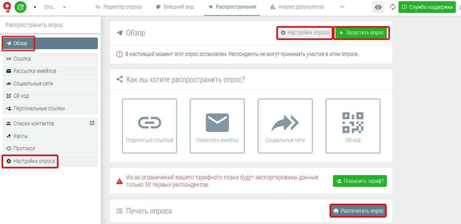 Также в этом раздели мы можем распечатать опрос, выбрать тариф для работы с системой, выбрать вариант распространения опроса. Еще один важный пункт – это Настройка опроса. К нему мы можем перейти либо через левое меню (в самом низу), либо кликнув по кнопке Настройки опроса.