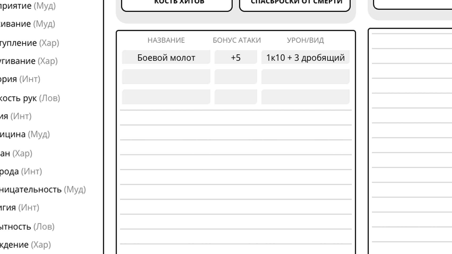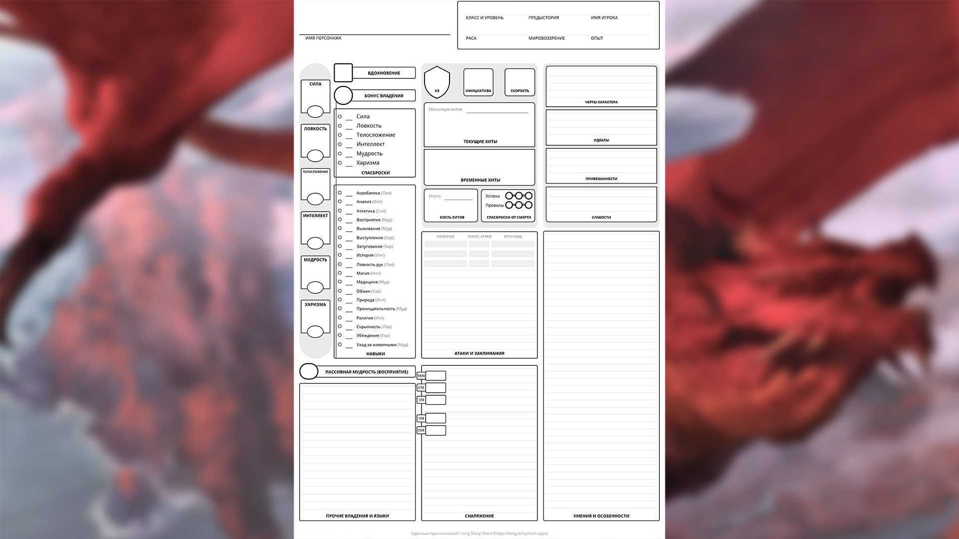 Вы можете воспользоваться нашим заполняемым листом. Он работает прямо в браузере и обладает минималистичным дизайном, который понравится вашему принтеру, если вы предпочитаете шелест бумаги свету экрана (печатать лучше из хрома). Но можно воспользоваться им и онлайн: он позволяет удобно бросать кости, отправляя результат в Discord, и берёт на себя часть рассчётов. Там же можно выбрать понравившийся вариант перевода: из SRD, официальный от Hobby World или фанатский от студии Phantom.