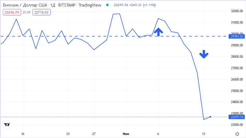 Реакция главной криптовалюты в день выхода новости была положительной – Биткоин подрос, однако в последующие четыре дня цена продолжила движение вниз в зону поддержки, а позже падение усилилось.