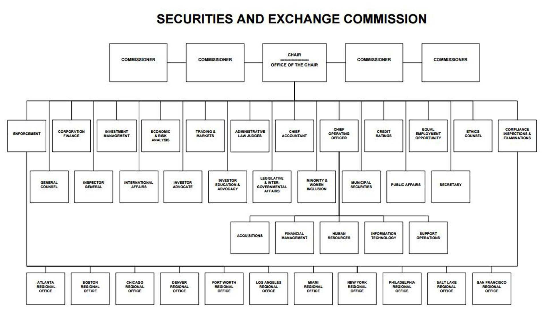 В SEC пять подразделений со штаб-квартирой в Вашингтоне и 11 региональных офисов по всей территории США.