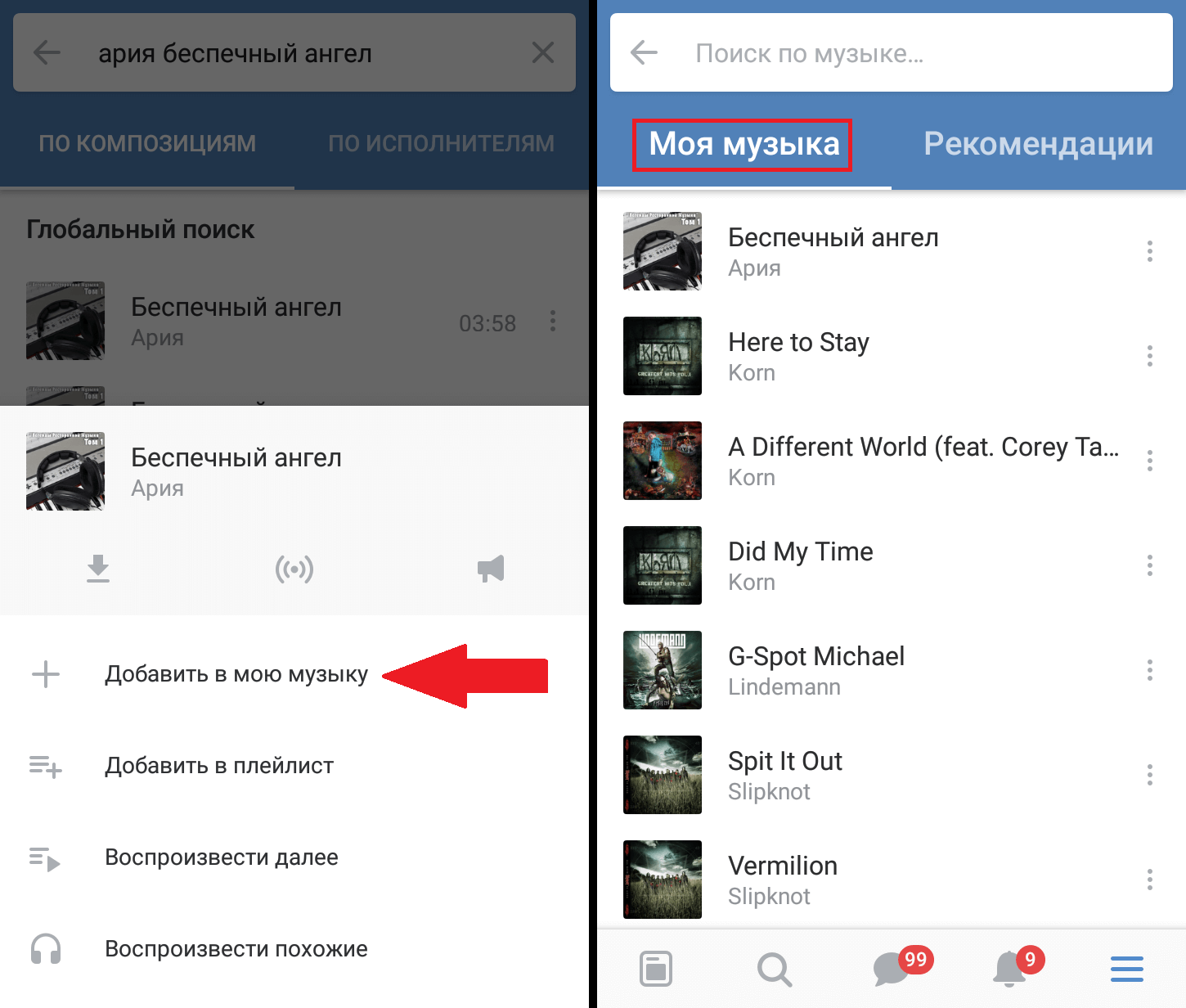 Еще один быстрый и удобный вариант – сохранение музыки из поиска. Для него используется внутренний поиск, через который легко можно найти нужную песню. После ввода названия аудио или имени исполнителя выйдет список треков с подходящими записями. Выберете подходящую и добавьте к себе в музыку, используя знак плюса.