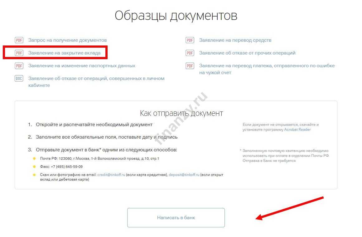 - Найдите на сайте раздел «Контакты». Внизу страницы есть образцы документов. Найдите форму заявления на закрытие вклада. Ее нужно распечатать и заполнить вручную, а также оставить подпись. После этого, отсканируйте или сфотографируйте заявления и отправьте по почте или электронному адресу организации. Чтобы правильно расторгнуть договор, вам нужно указать в форме реквизиты для перевода денег и желание отказаться от услуг банка. Также добавьте свой номер телефона, чтобы специалисты могли связаться с вами, поставьте дату и подпись.