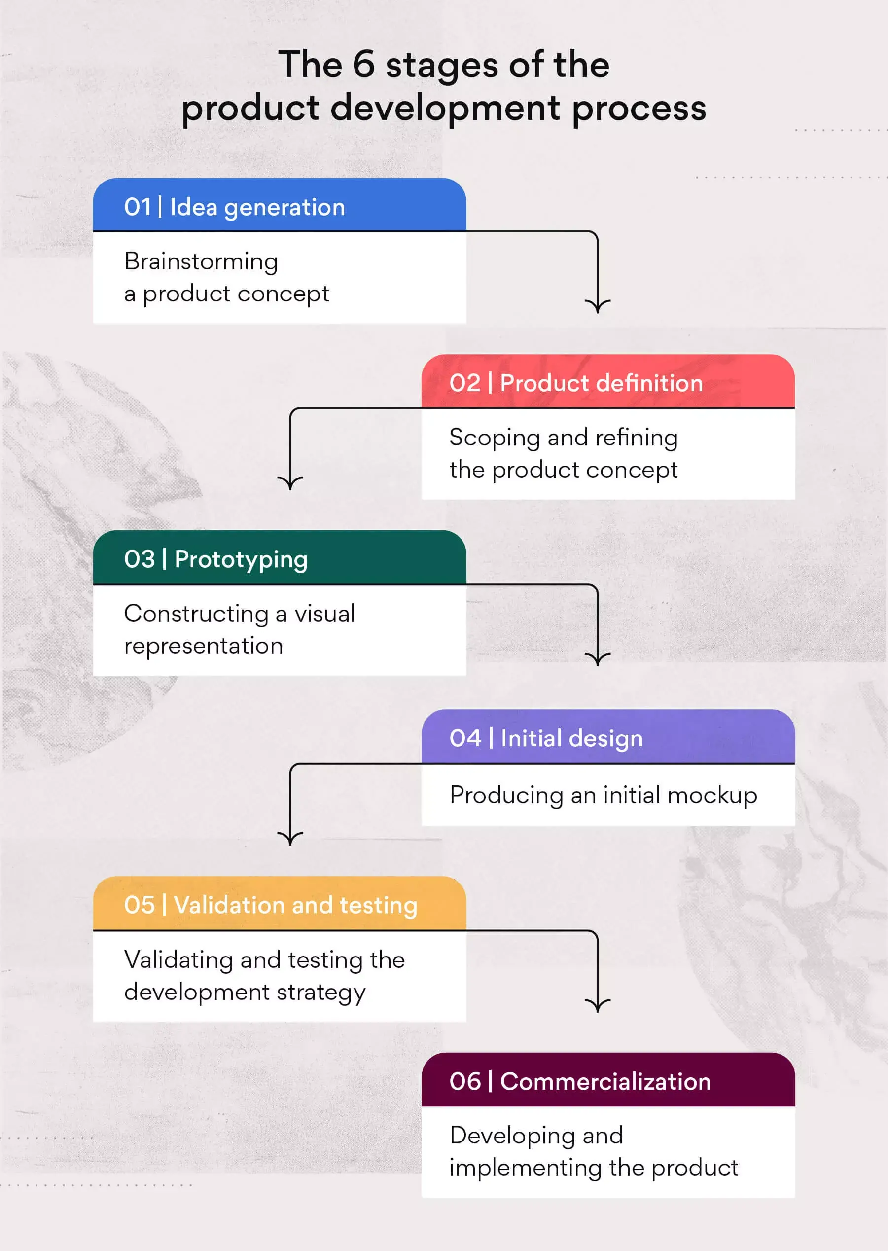 Процесс разработки продукта начинается с выдвижения новых идей. На начальном этапе проводится коллективное обсуждение предложенных идей концепции продукта с учётом потребностей клиентов, факторов ценообразования и результатов рыночных исследований.