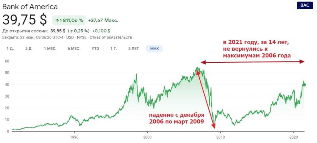 Акции Bank of America в течении 2 лет упали с 54$ до 3$ потеряв в цене практически 100%. За следующие 14 лет так и не вернулись к своим максимумам. И это крупнейший банк в США. Таких примеров огромное количество.