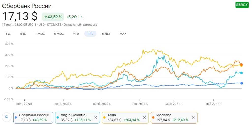 На картинке ниже показано насколько за год выросла стоимость акций таких компаний как Tesla, Virgin Galactic, Moderna в сравнении с акциями Сбербанка.