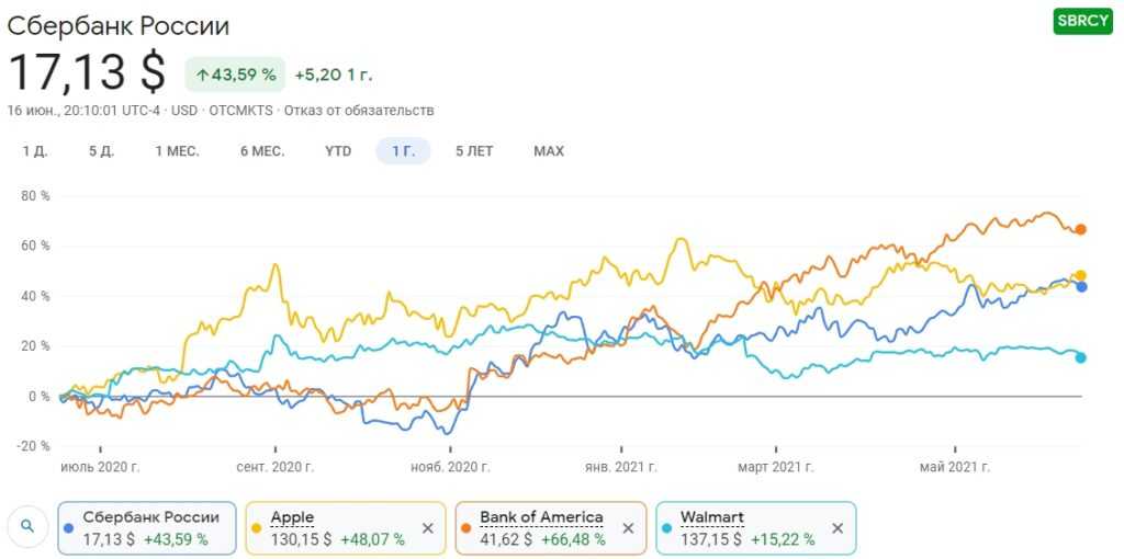 На картинке ниже показано насколько за год выросла стоимость акций таких компаний как Apple, Bank of America, Walmart в сравнении с акциями Сбербанка.