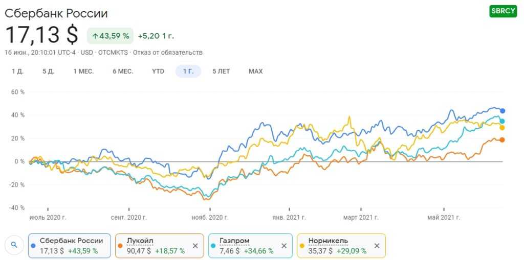 На картинке ниже показано насколько за год выросла стоимость акций таких компаний как Лукойл, Газпром, Норникель в сравнении с акциями Сбербанка.
