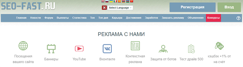 Минимальная сумма выплаты – 10 рублей. Seo-Fast также подключен к многим платежным системам, доступен вывод на банковскую карту.