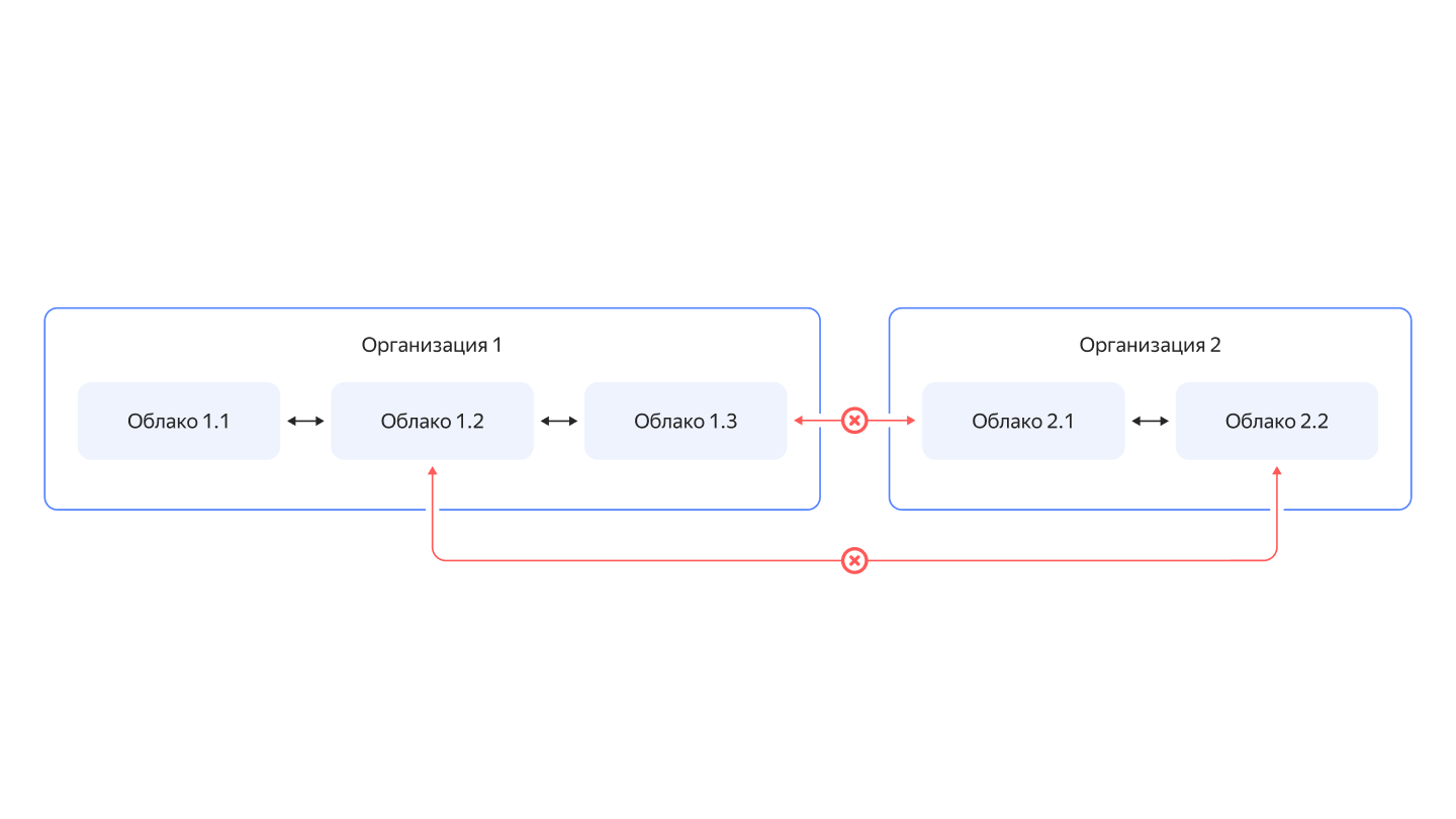Все облака принадлежат организациям, внутри одной организации может быть создано несколько облаков. Разные организации и их ресурсы изолированы друг от друга.