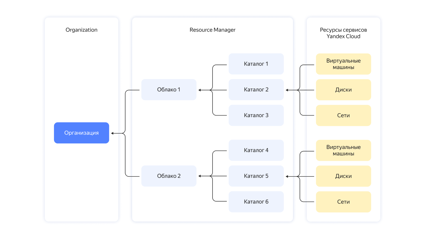 Ресурсная модель — это иерархическая модель сущностей, которая позволяет упорядочивать облачные ресурсы и обеспечивать необходимый уровень изоляции между ними. В Yandex Cloud управлять ресурсами помогает сервис Yandex Resource Manager.