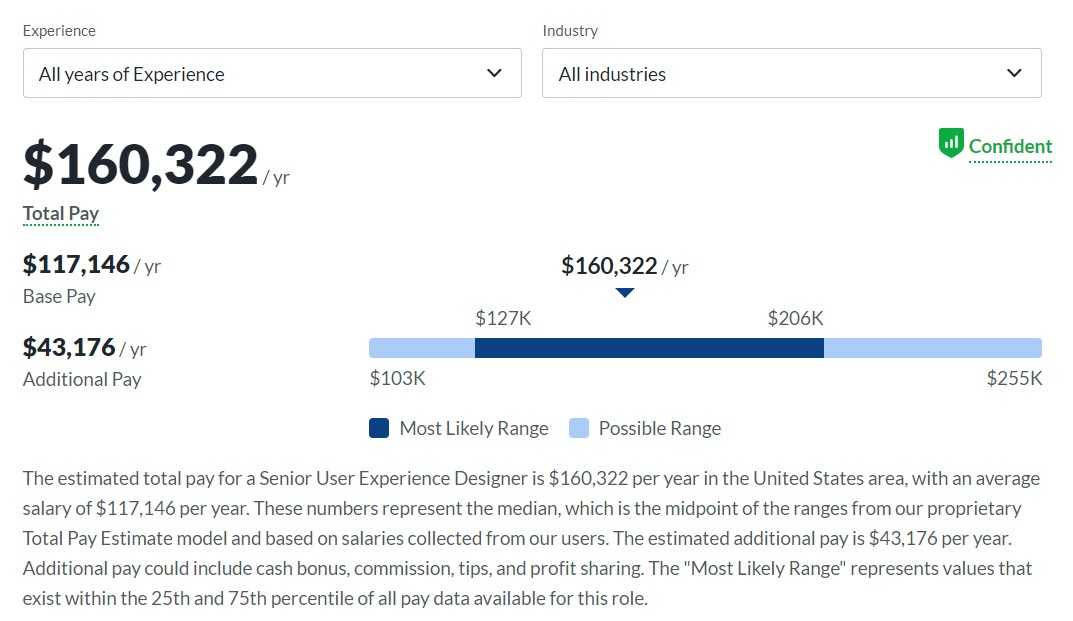 Согласно сайту ZipRecruiter, старший дизайнер UX может рассчитывать на заработок около 116 400 долларов США в год или 9700 долларов США в месяц!