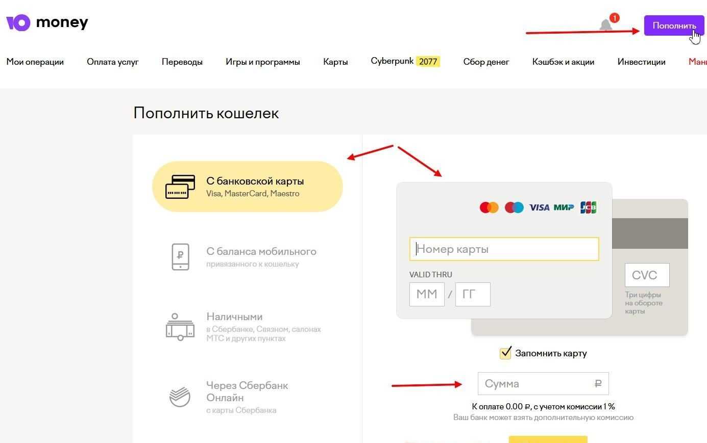 Эти три способа пополнения доступны для кошелька, но не стоит забывать, что у карты с ним – одинаковая сумма. Если нужно сделать это без комиссии, то с любой карты финансово- кредитной организации, обратившись в банкомат Сбербанка. Если речь идет о кредитке, то у эмитента может дополнительный сбор в увеличенном размере. Эти нюансы лучше уточнить заранее.