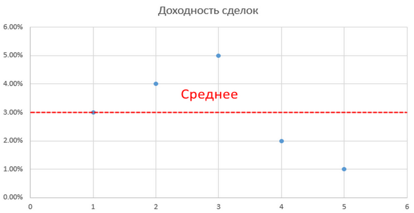 Во втором случае прибыльность торговых сделок составила: 2, 1, 0, 4, 6 %. Их среднее арифметическое равно 2,6%. Результаты аналогичной предыдущему способу операции: -0,6; -1,6; -2,6; 1,4; 3,4 %. Затем, как и в предыдущем случае:
