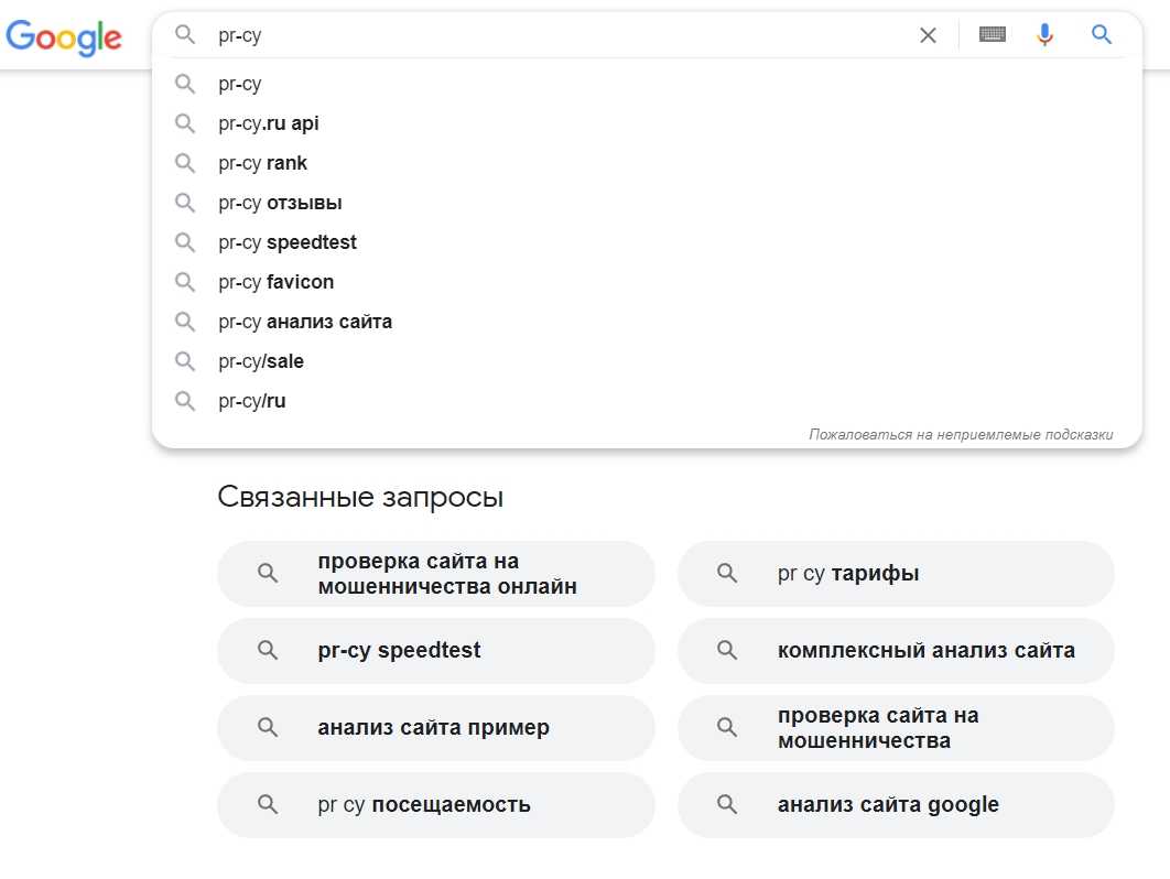 Подсказки в Google по запросу «pr-cy»