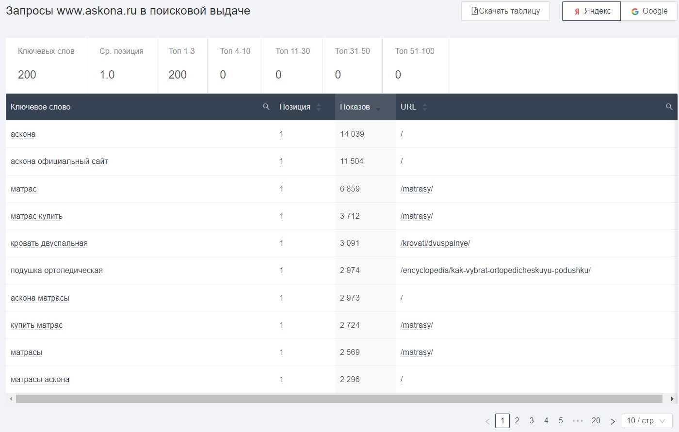 Посмотреть семантику любого сайта можно через бесплатный инструмент: введите адрес сайта и смотрите список с позициями и показами. Файл можно скачать.
