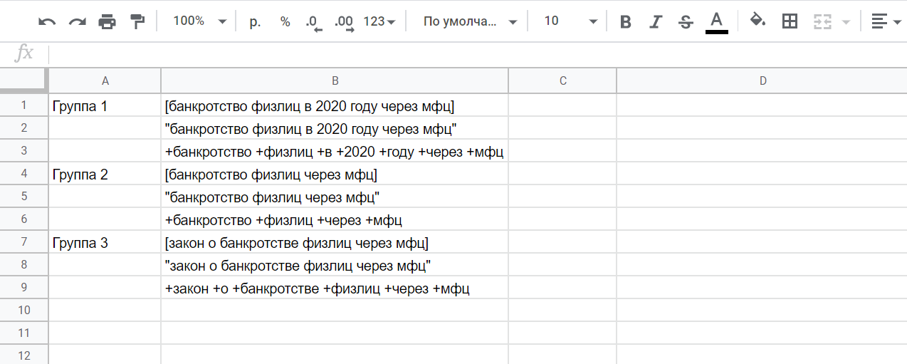 При такой группировке в каждую группу объявлений добавляется одна ключевая фраза, которая прописывается в трех типах соответствия: точном, фразовом и с модификатором широкого соответствия. Таким образом, мы можем анализировать CTR и оставлять в группе только то соответствие, которое работает наиболее эффективно.