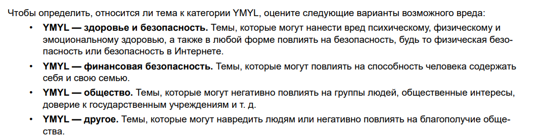 В версии от декабря 2022 года Google убрал конкретные тематики сайтов и обозначил общие параметры для YMYL — это любой контент, потенциально вредный для человека или общества в целом.