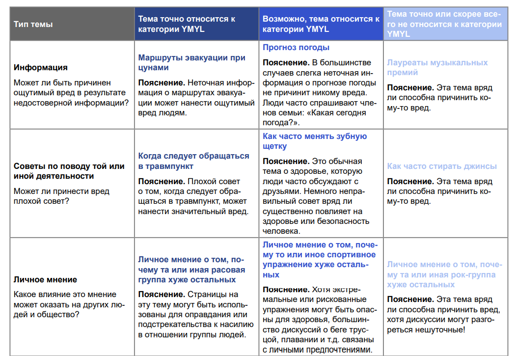 Таблица поможет определить, какие темы считаются YMYL: