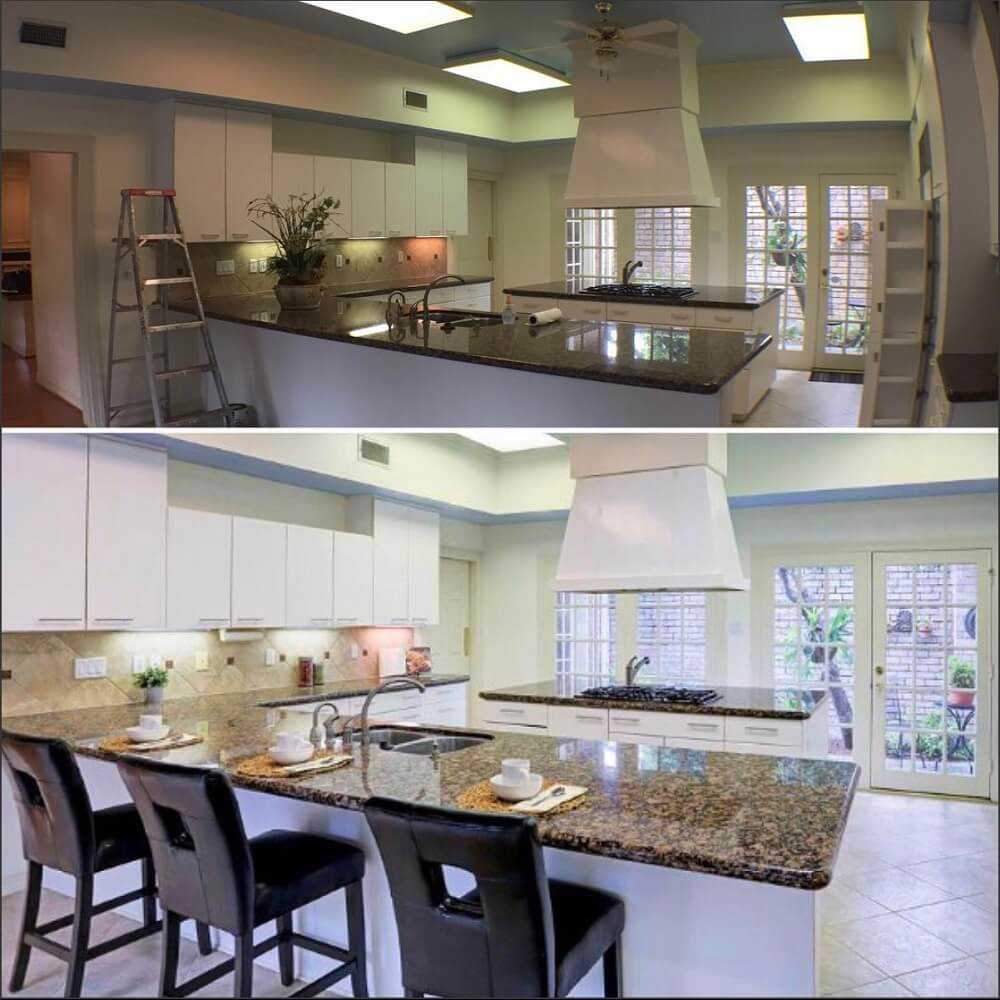 Пример работы хоумстейджера из аккаунта Three Bears Home Staging в соцсетях. Другое освещение, посуда и другие мелкие детали уже делают помещение более уютным