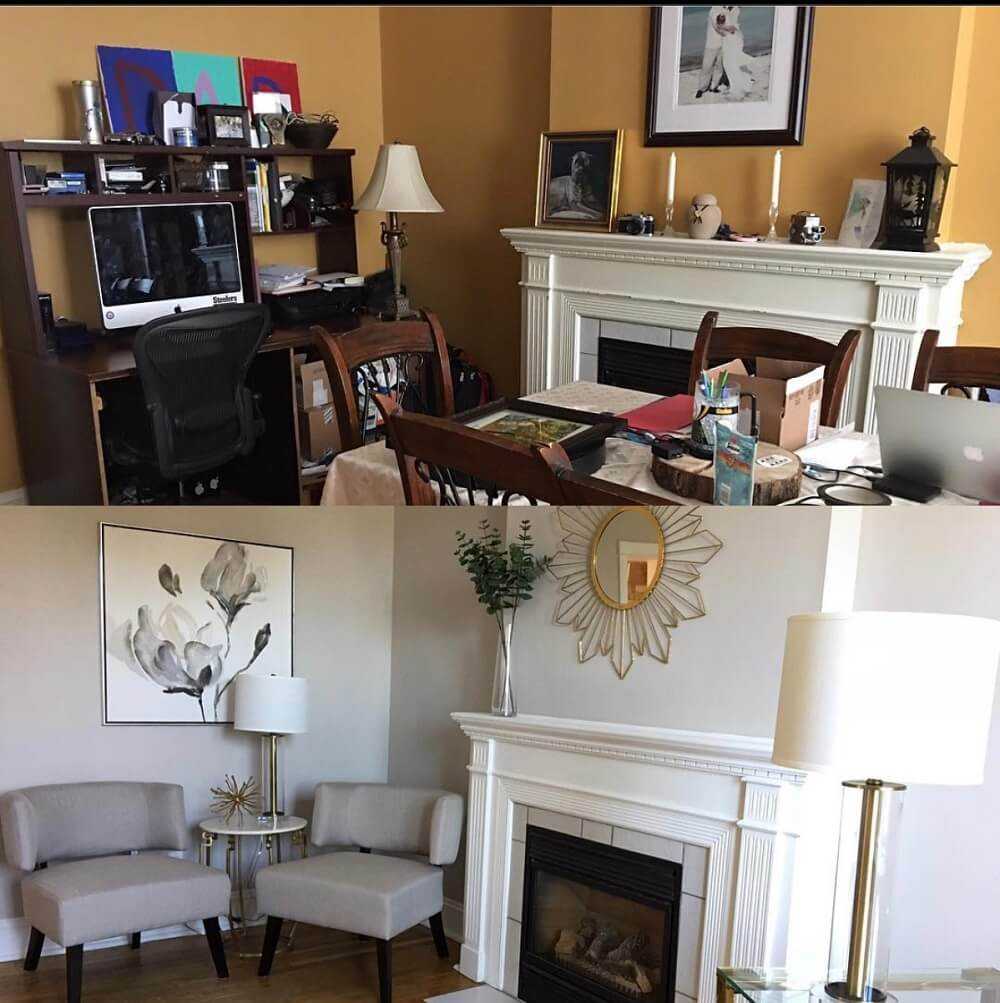 До и после стейджинга: в комнате стало больше воздуха и она приобрела аккуратный вид за счёт другого цвета стен, убранных вещей, предметов интерьера. Пример из аккаунта Simone Frank в соцсетях