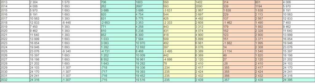 С 2029 года Виктор уходит на пенсию. Таким образом, доходы в виде заработной платы с 2029 года прекращаются, и семья начинает жить на процент от накопленного капитала. Мы видим это в таблице «План текущих доходов и расходов» в строке 2029 года, как отсутствие доходов от текущей деятельности. Видим и в таблице «План накопления капитала» в строке 2029 года, как изъятие капитала для жизни из инвестиционных инструментов.