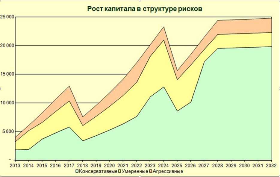 Стоит также отметить, что в 2027 году за пару лет до выхода на пенсию необходимо скорректировать инвестиционную стратегию на более консервативную, так как Олеся и Виктор уже не могут себе позволить рисковать своим капиталом, как раньше – теперь он их «кормилец». Вы можете видеть в таблице «План накопления капитала» в строке 2027 года эту корректировку: изъятие капитала из агрессивных и умеренных инвестиций в пользу консервативных. С этого момента капитал будет приносить меньший доход, чем раньше – около 5% годовых, но зато более надежно.