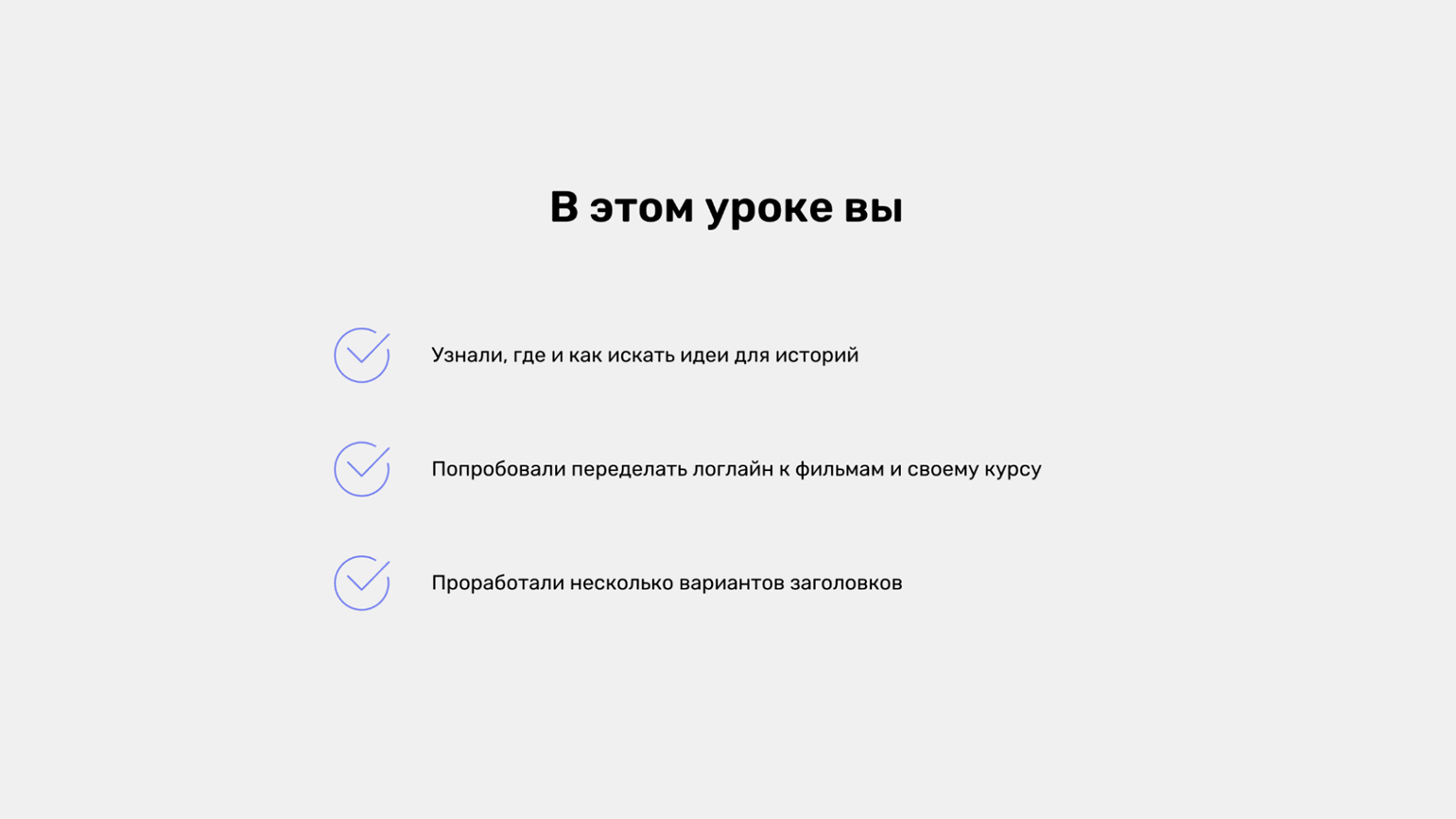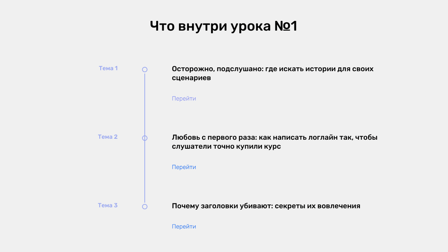 Одно из главных правил успешного курса — единый шаблон для всех уроков. Он задаёт понятный студенту ритм: на первом уроке человек знакомится с форматом и структурой, а на втором и далее чётко понимает, что его ждёт. Конечно, элементы могут меняться, но их основная канва останется.