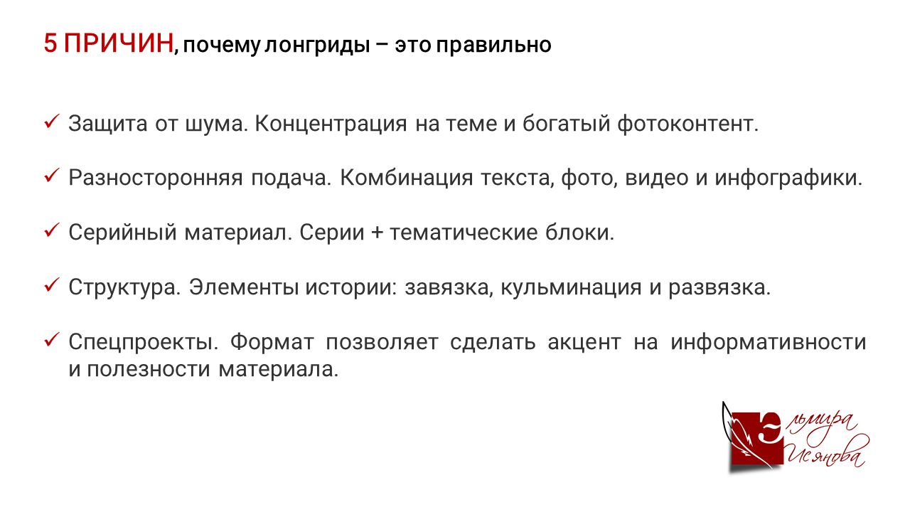 Интересная идея, которой делится Марина: лонгрид — тот формат, который можно дорабатывать до бесконечности, то есть уже после публикации. Один раз написали лонгрид, вложили в него огромное количество времени, труда и частичку души — и вот вам готовый «вечнозеленый контент», который будет служить столько, сколько потребуется.