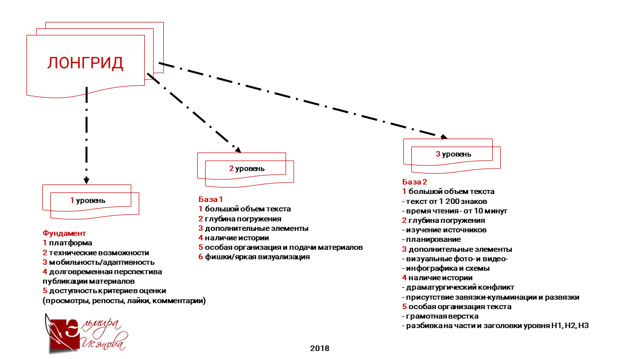 Формат лонгрида помогает разнообразить материал, подойти к нему с разных сторон и найти нужную подачу для каждого читателя. Лонгрид включает в себя не только текст, но и фото, видео и инфографику. Это значит, что можно найти подход к разным читателям, привыкшим структурировать и воспринимать материал по-разному. Для автора это возможность раскрыть материал более глубоко и разносторонне. Вот такую инфографику делала специально для продвижения первых лонгридов своего журнала, каждый выпуск был как отдельный лонгрид, по итогам выпуска получила положительный отклик (было более 30 подписок на журнал в первые 3 часа публикации).