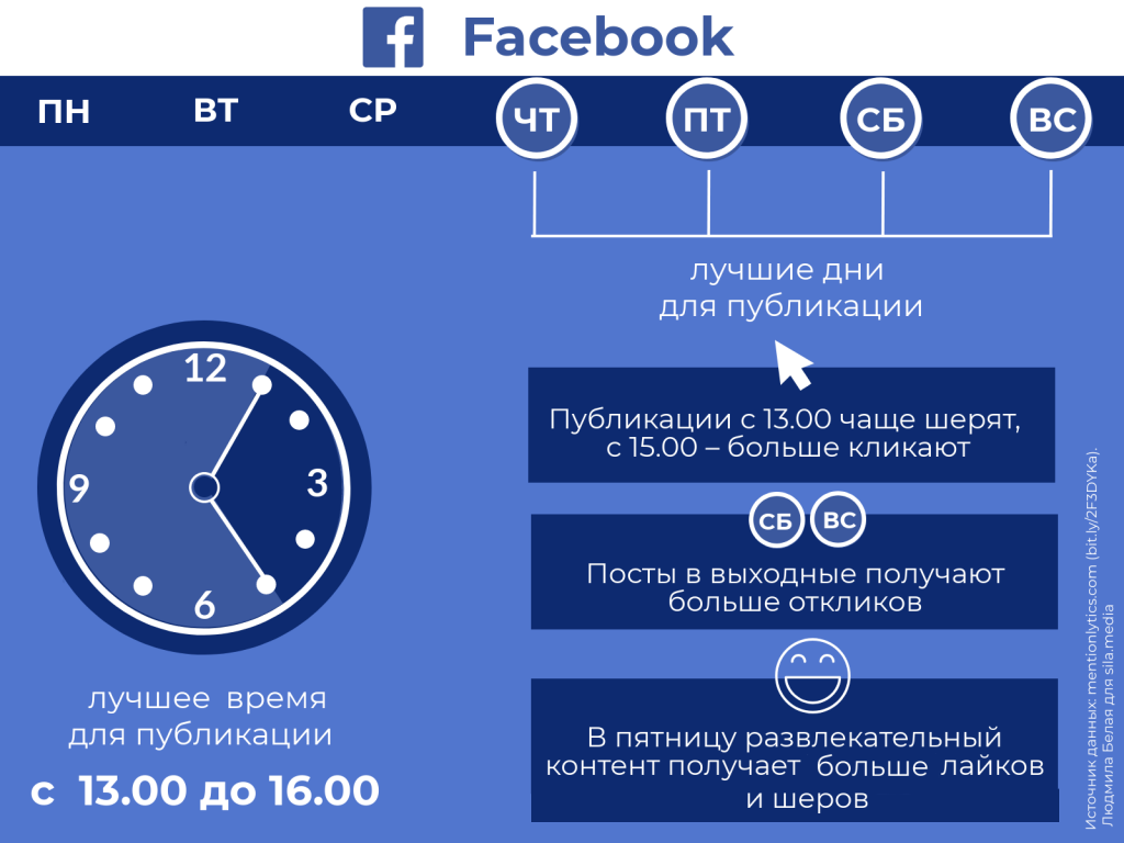 Фейсбук — мастодонт среди социальных сетей, которым пользуются миллионы людей со всего мира. Эксперты затрудняются точно определить, в какое время лучше делать постинг на этой платформе. Однако в ходе исследований было установлено, когда растет пользовательская активность. Так, например, пиковое время отправки сообщений в Фейсбуке — между 13 и 16 часами в будни и с 9 до 11 утра на выходных. Прайм-тайм посещаемости страниц был отмечен по четвергам и пятницам. Лучшее время, чтобы выкладывать публикации по субботам — с 00 до 1 ночи.