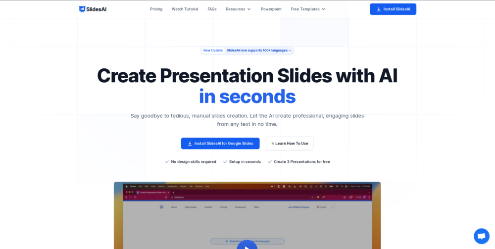 - Легко создает презентации из текста или тем, поддерживая более 100 языков для широкой доступности.