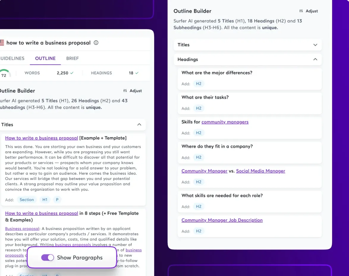 - Структурированные заголовки и подзаголовки: Рекомендуемые заголовки и подзаголовки, которые помогают организовать ваш контент для лучшего пользовательского опыта и SEO-производительности.